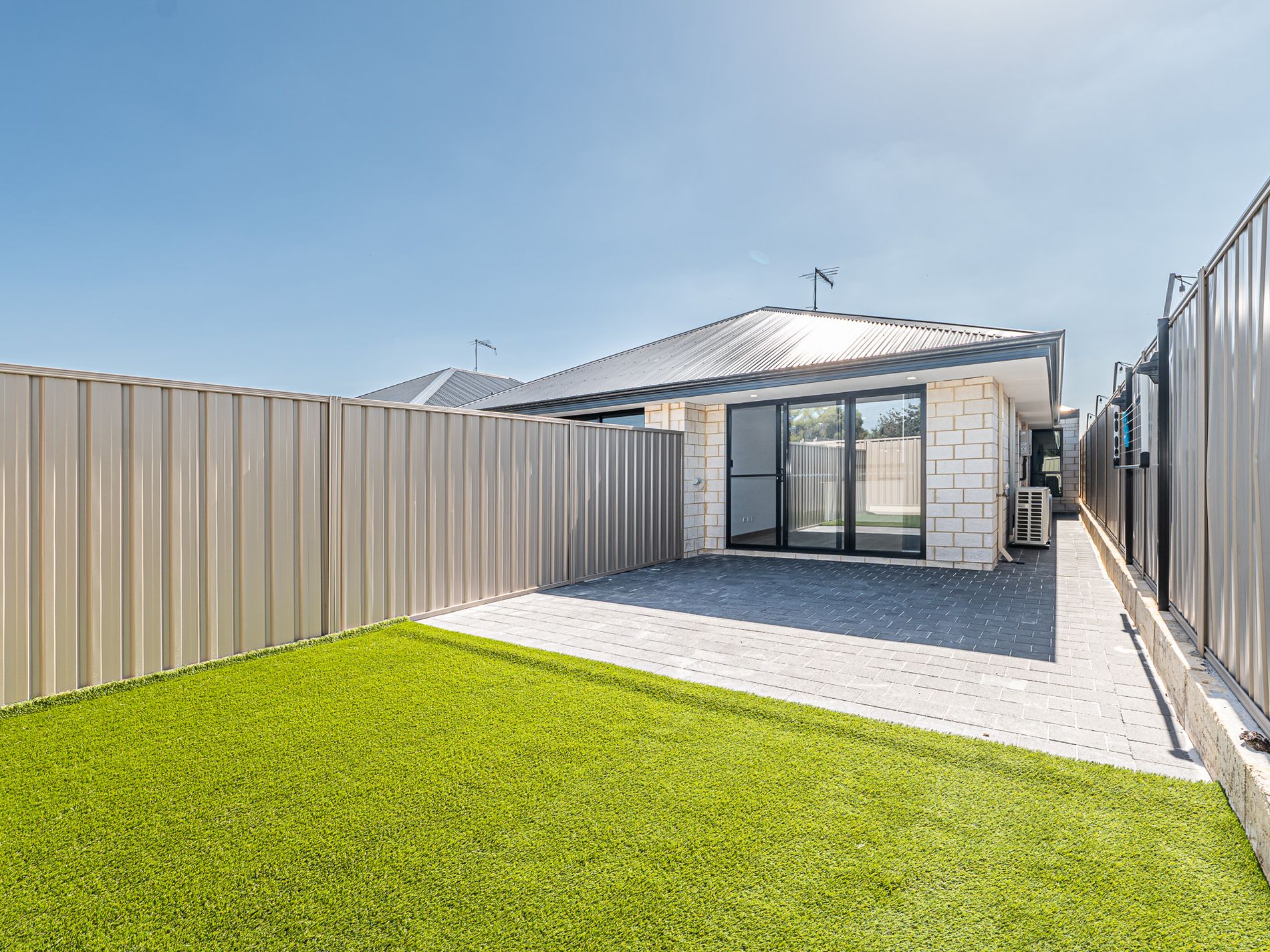 - Paved backyard with low-maintenance artificial lawn
