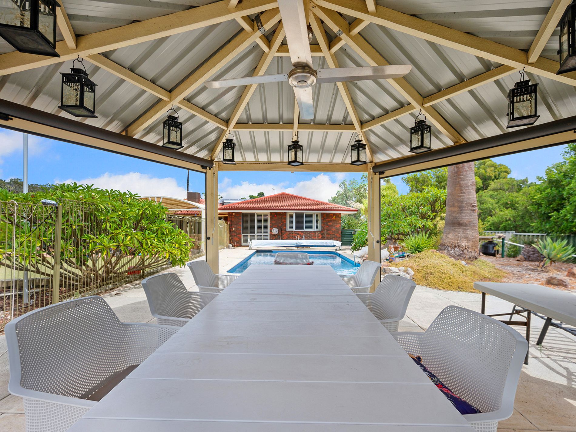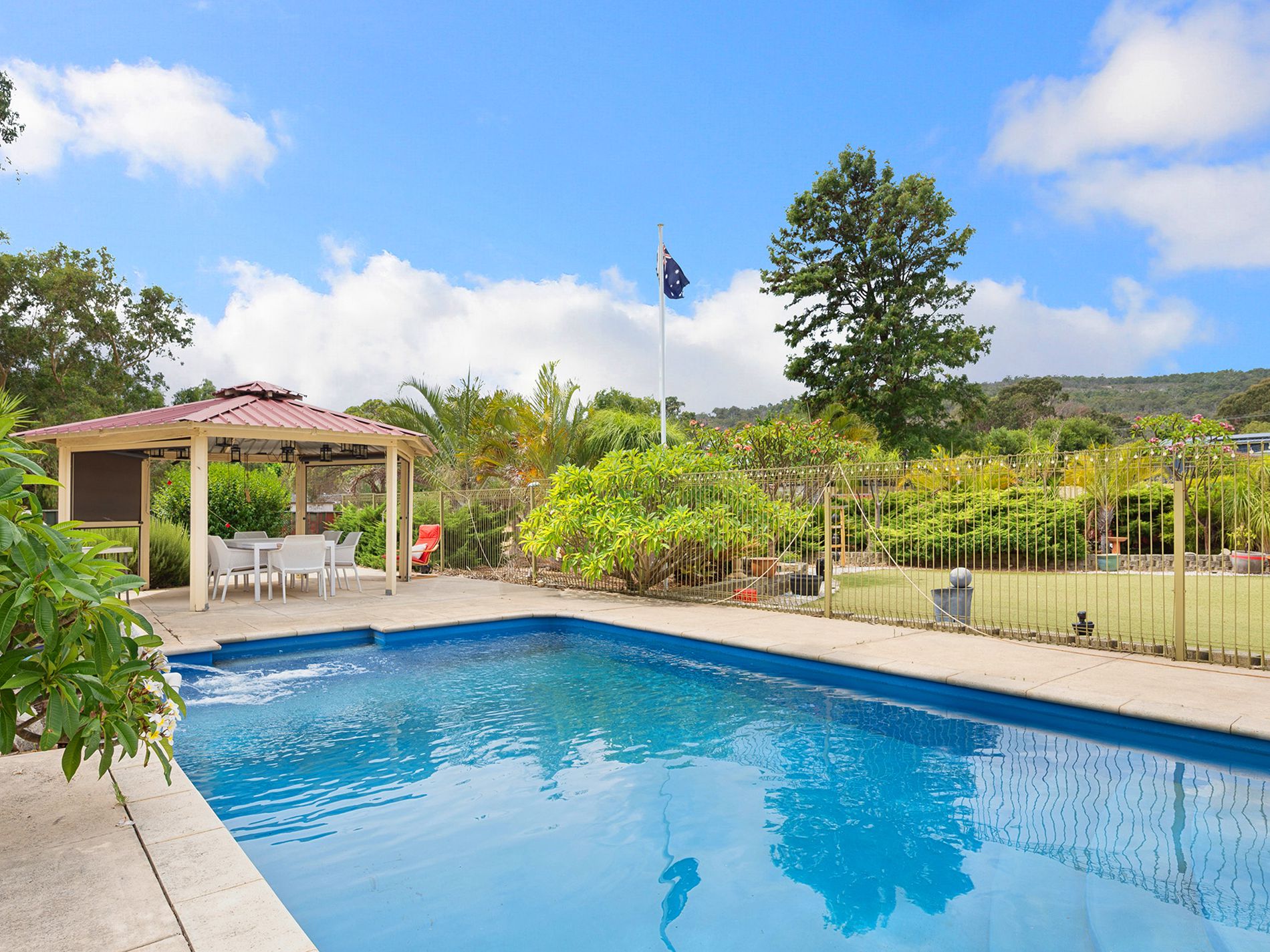 Sparkling below ground pool with gazebo