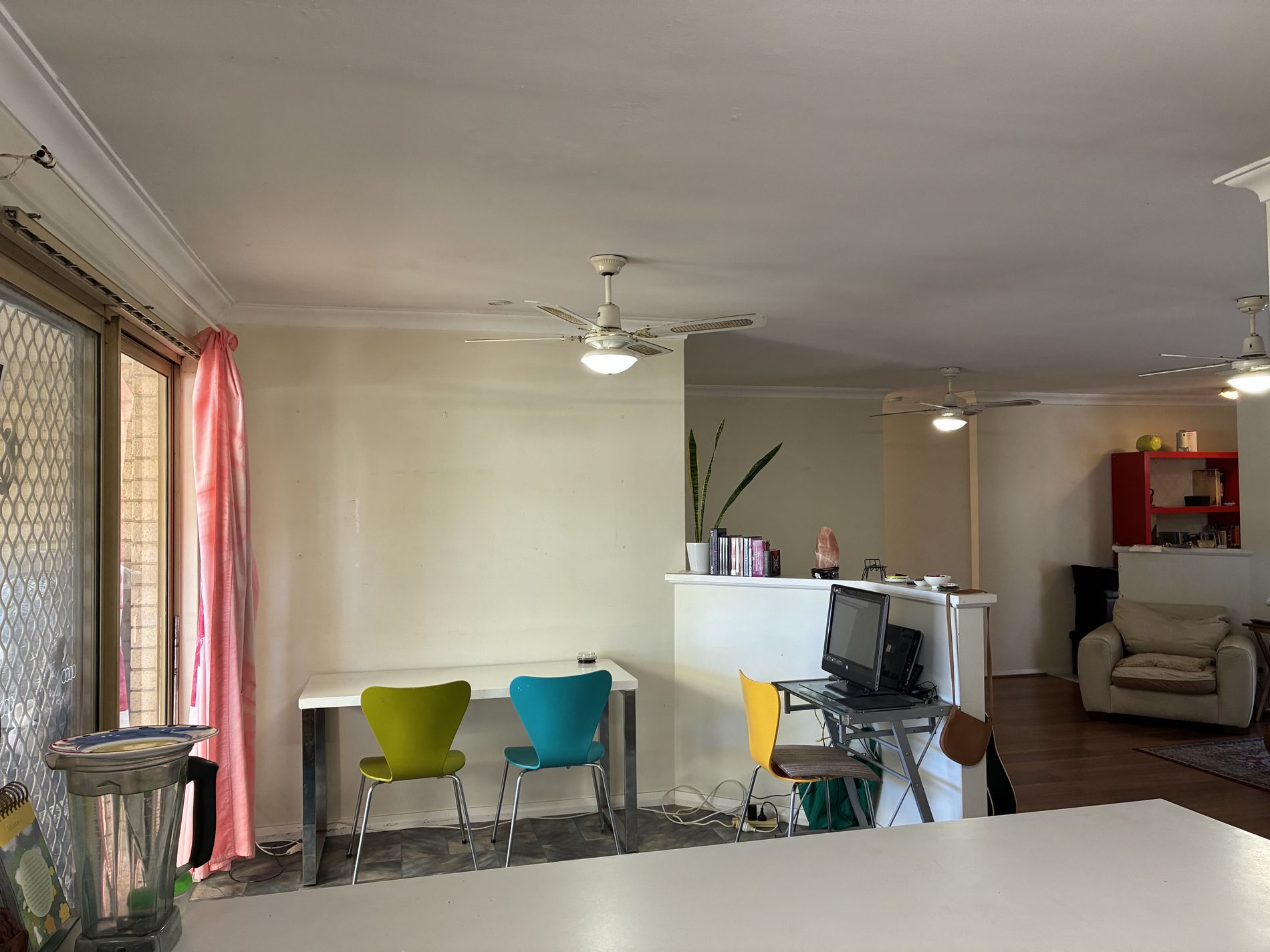 Open plan dining with ceiling fan