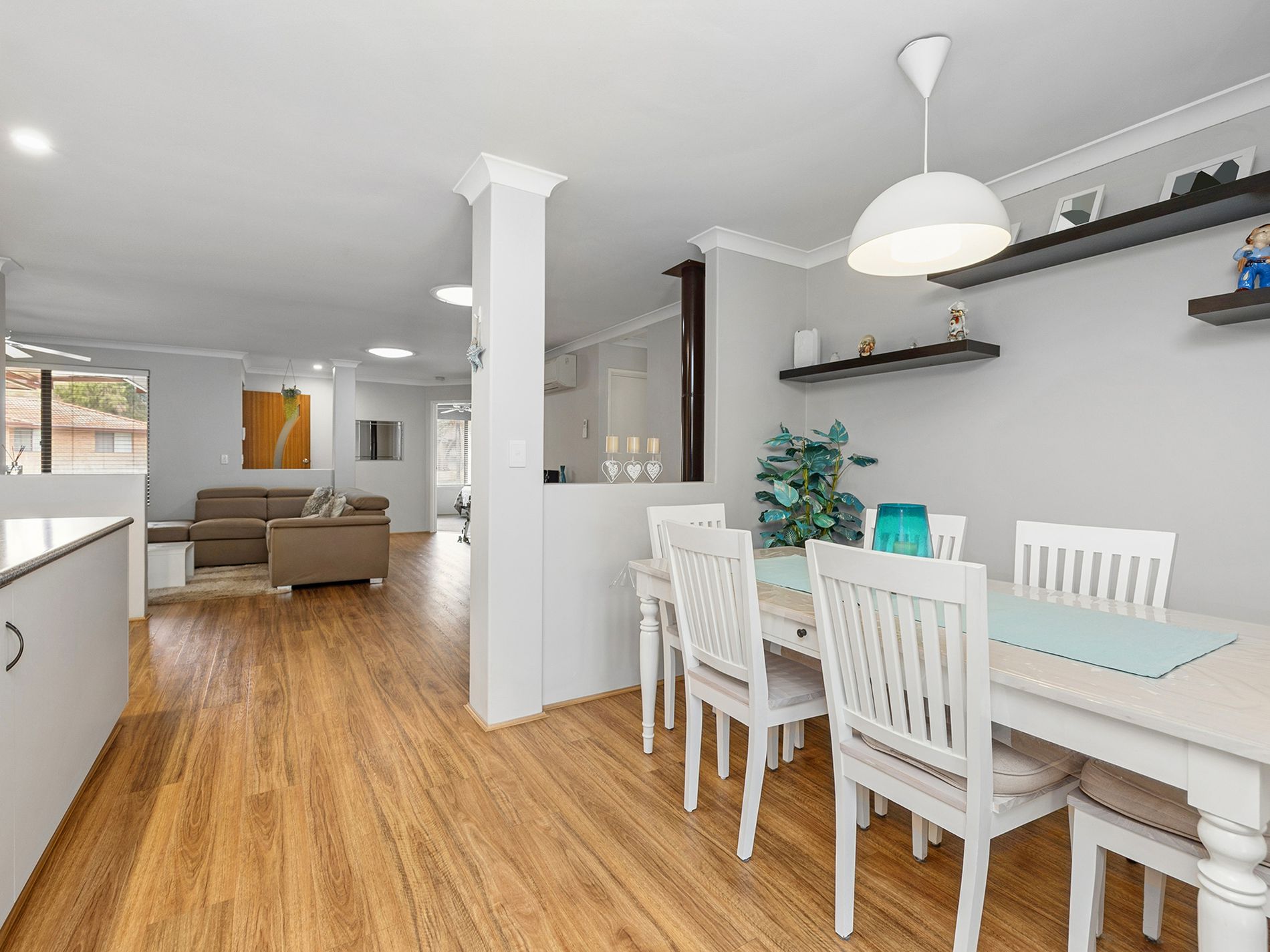 Open plan living and dining with fireplace