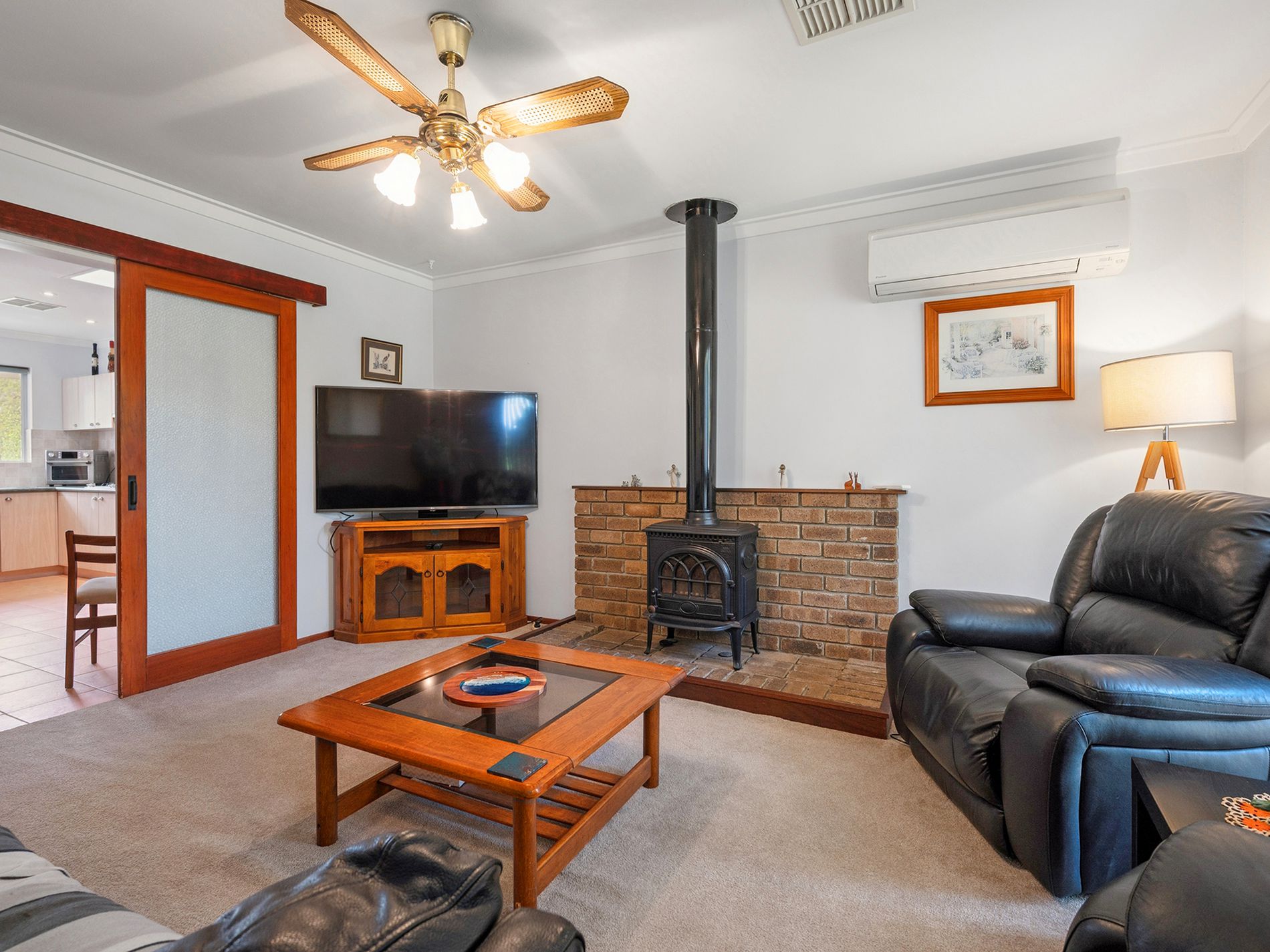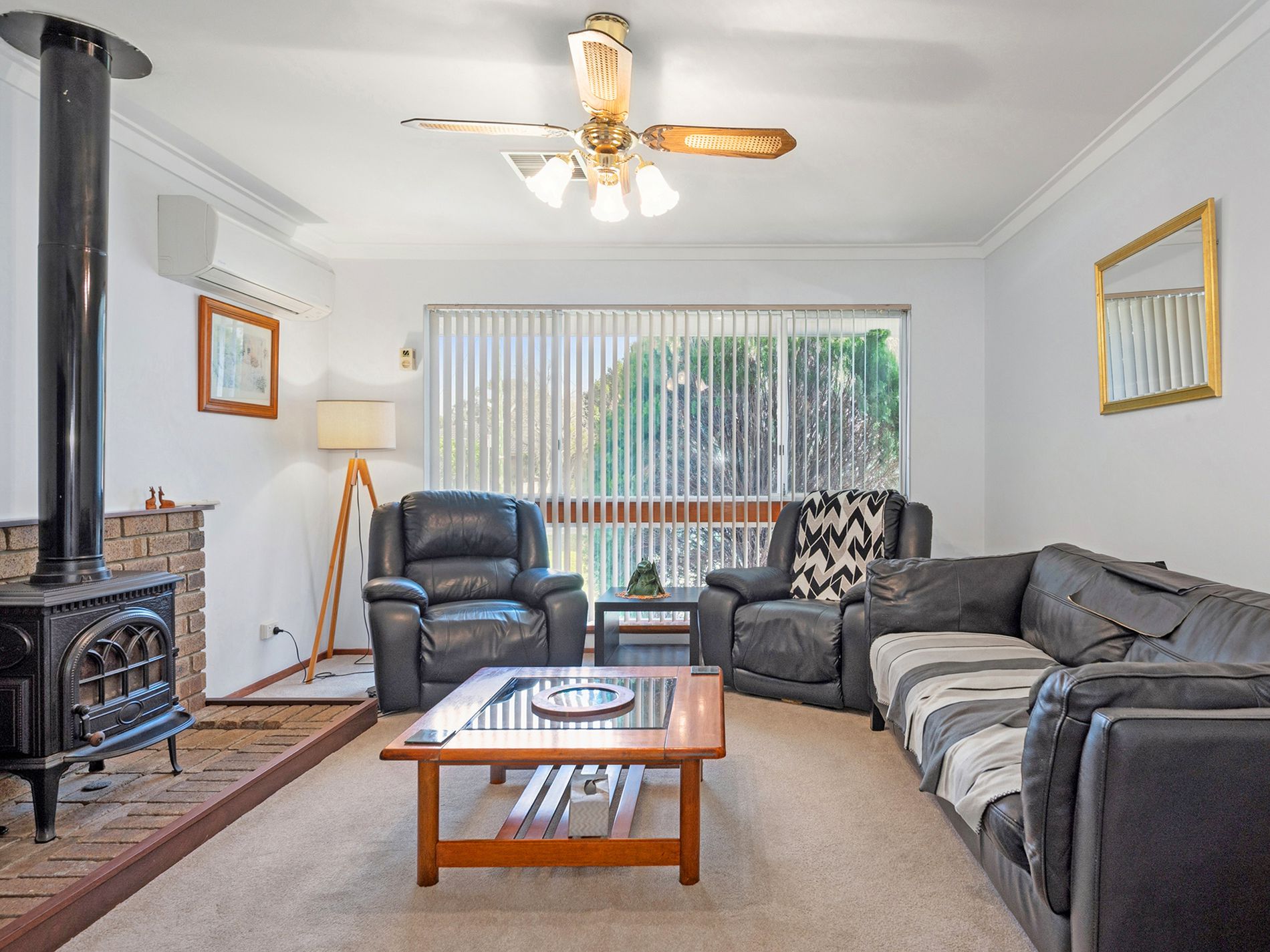 Enclosed living room with split system and fireplace